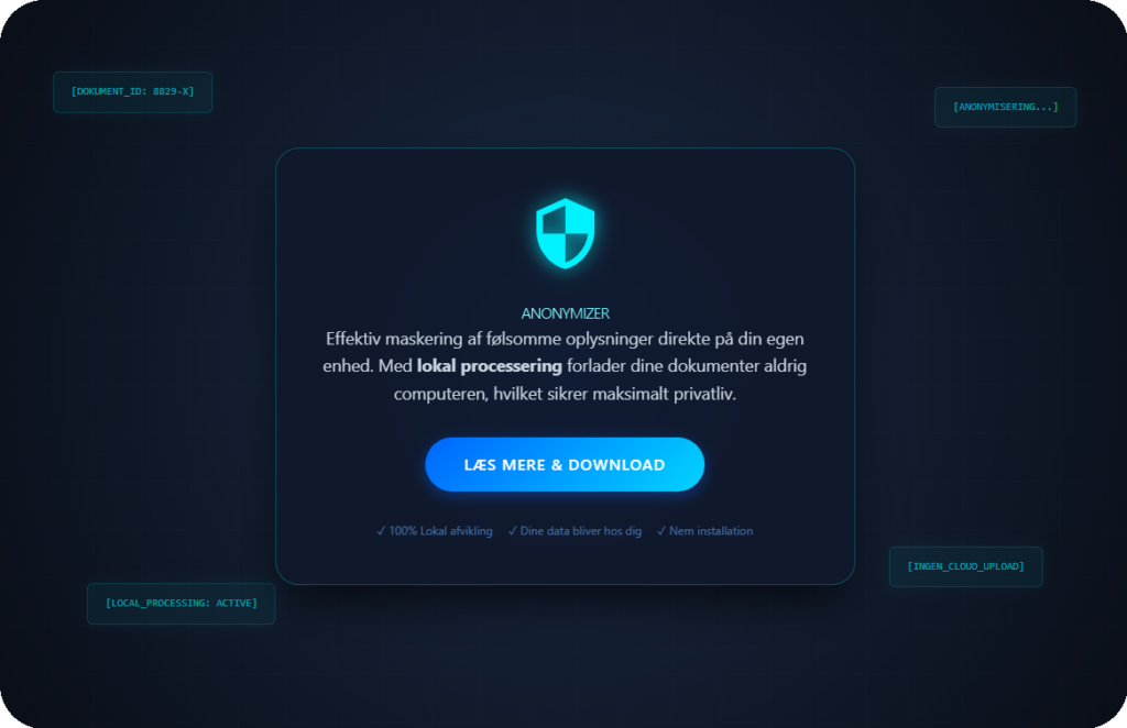 Maskér følsomme oplysninger hurtigt og sikkert direkte på din computer. Med lokal processering forbliver dine dokumenter hos dig – uden cloud upload og uden at data forlader enheden. Perfekt til arbejde med fortrolige filer, hvor privatliv og compliance er afgørende.